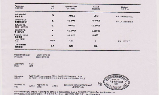 甲酸主含量≥85%,Fe≤4ppm